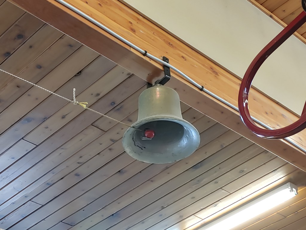 I am guessing that the original fire bell is the one that is still hanging inside the fire hall today. I know for sure that it did hang in the first town hall/ fire hall. It was used to sound the fire alarm to call the firefighters to duty.