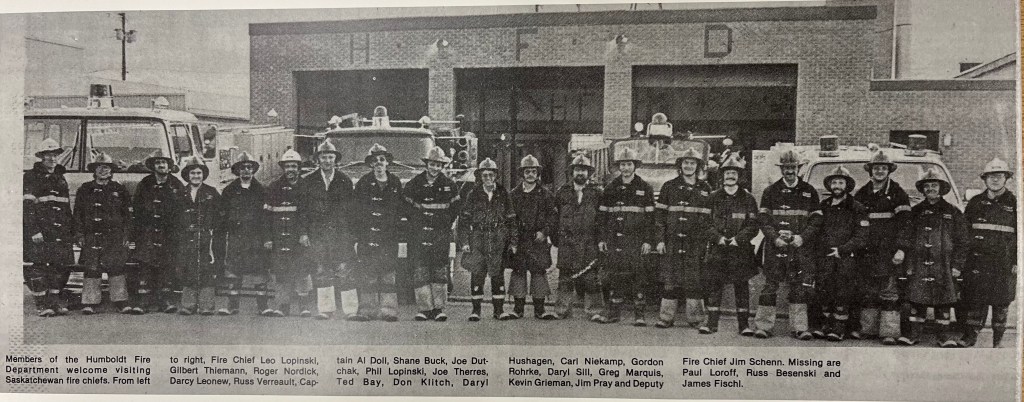 On December 2, 1961, 23 delegates gathered to discuss final plans for the stablishment of the Humboldt and District Fire Protection Organization. Along with the Humboldt Fire Department, Watson, St.Gregor, Englefeld, LeRoy, Bruno and Lake Lenore intended to donate a percentage of their property tax income to purchase a pumper that could be used in each of the fire departments in this area. These plans took nearly three years to complete and a rural truck was purchased. On October, 1986, an official motion to form a Mutual Aid Agreement, the Town of Humboldt went into an agreement under Bylaw No. 16/86 headed by Mayor Matt Breker to form mutual aid between, the Town of Humboldt, the Village of Muenster, the Village of St. Gregor, the R.M. of Bayne #371, the R.M. of Humboldt #370, the R.M. of Wolverine #340 and the Village of Lake Lenore. Even though this agreement has gone over some bumps in the road it still stands today.
